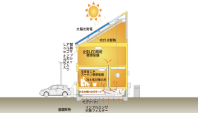 屋根にのせている太陽光パネルは断熱・遮熱材として効果があり耐久性も40年と最高品質です。夏は屋根への直射日光を遮ってより涼しく、冬は外部への放熱を抑えてより暖かくなります。