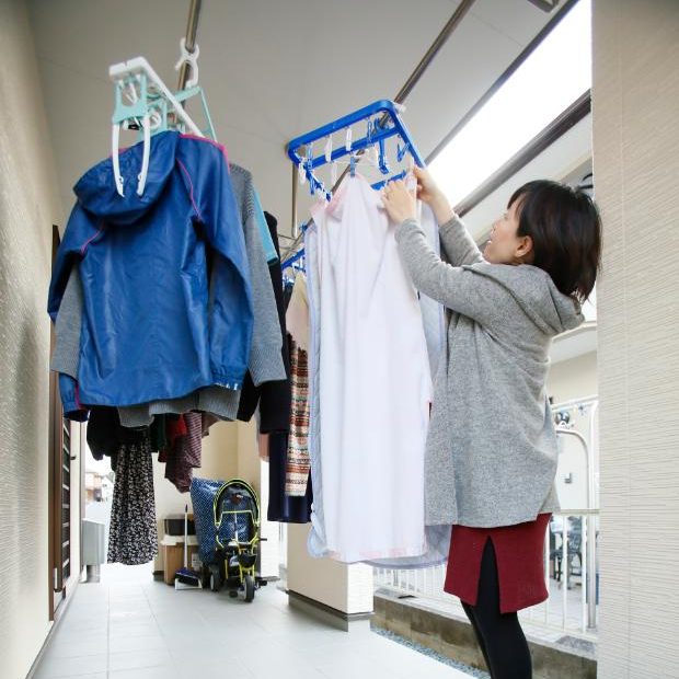 家事1/2設計では、洗面とキッチンが近くにあるのはもちろんの事ですが、雨が降っても安心な軒下に物干場も配置し、家事動線がコンパクトにまとまりました。家事をしながら子どもが見えるのも最高ですね。